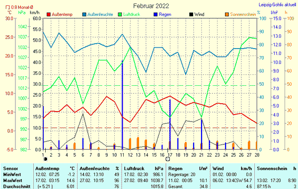 | Luftdruck | 986,1 hPa | 02:30 | 17.02.2022 | 1038,7 hPa | 09:40 | 27.02.2022 | 1015,8 hPa | |||