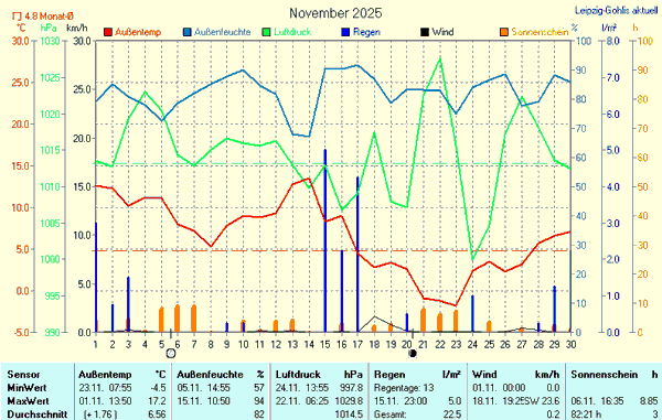 | Windchill | -4,9 °C | 22:35 | 23.11.2025 | 17,2 °C | 13:50 | 01.11.2025 | 6,5 °C | |||