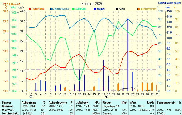| Luftdruck | 978,1 hPa | 15:45 | 12.02.2026 | 1026,7 hPa | 10:55 | 20.02.2026 | 1008,6 hPa | |||